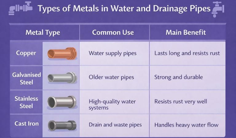 Homes use different types of metal pipes for plumbing. Each metal has its own use, strength and cost. For example, plumbers often use copper pipes because they last a long time and do not rust easily. In older homes, you may also find galvanised steel pipes.Â