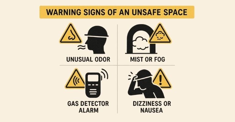 Equipment-related signs matter as well. A gas detector that alarms even once should stop work immediately. A ventilation system that fails to start creates another red flag. A missing permit or incomplete risk assessment signals that the system of work is not ready. Entering without these controls sets everyone at risk.