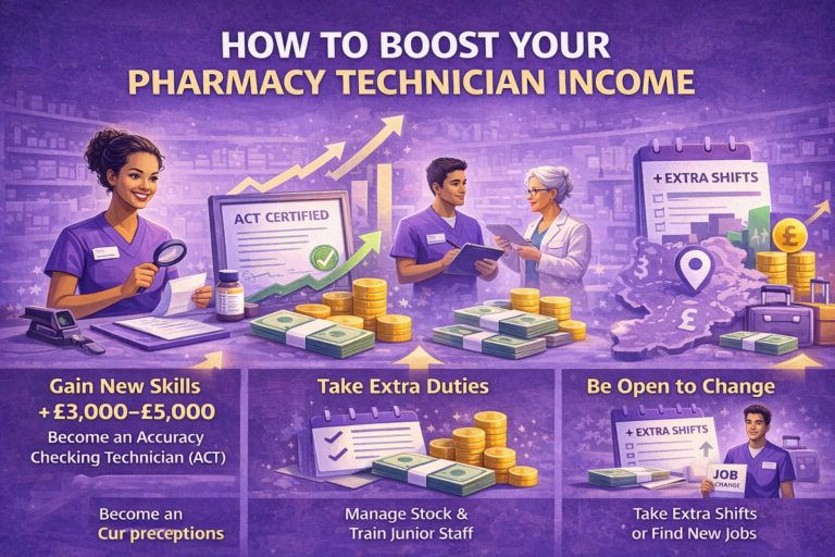 Finally, stay open to moving. A new job in another area or sector can raise your pay by several thousand pounds. Meanwhile, being flexible and learning new skills gives you more chances to earn. Overall, gaining new skills, taking responsibility, and being open to change are simple ways to increase your pharmacy technician income.